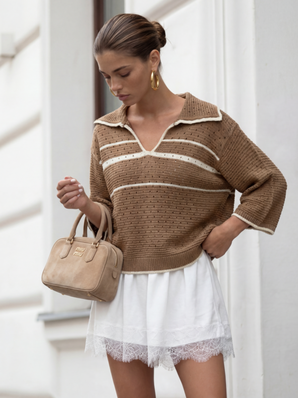 Ponadczasowy sweterek Kendrick wykonany z wysokiej jakości przędzy w ażurow splot. Szyku dodają kontrastujące lampasy oraz ściągacz na dole. Krój polo został wzbogacony szerokim kołnierzykiem, który swobodnie opada na ramiona. Uniwersalna, niebanalna opcja do wielu stylizacji. Made in Poland. Producent Yarn Studio. Prezentacja produktu wykorzystuje wizualizacje AI.