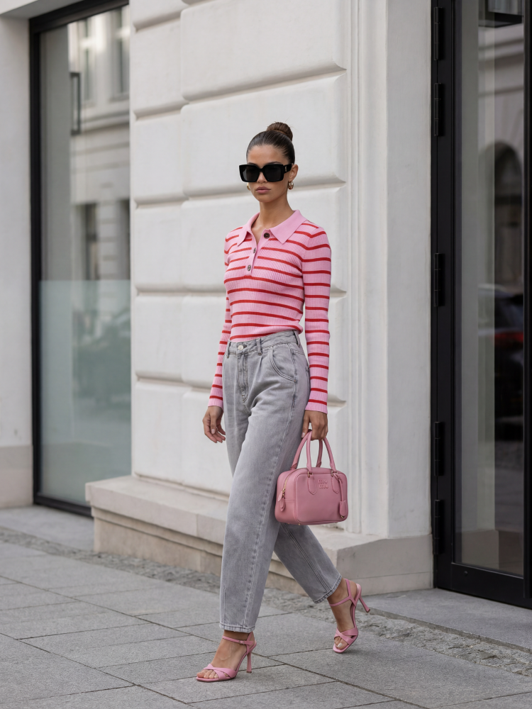 Sweter Lois to model o kroju polo, w ponadczasowy, pasiasty print. Wykonany z wysokiej jakości przędzy miłej w dotyku. Prążkowana przędza zapewniąidealne ułożenie. Dodatkowo, głębokość dekoltu możemy regulować za pomocą guzików. Produkt z importu. Prezentacja produktu wykorzystuje wizualizacje AI.