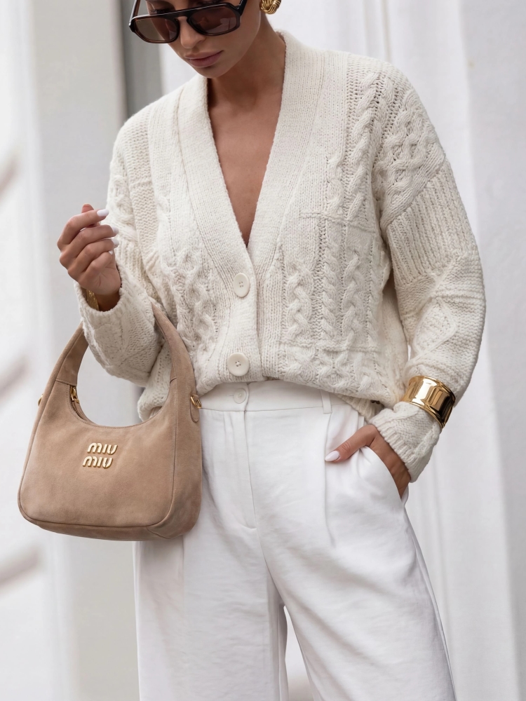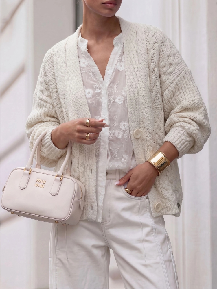 Fantastyczny sweterkowy kardigan Manili o modnym splocie typu warkocz. Zapinanie na obszerne guziki to modne i praktyczne rozwiązanie. Wyjątkowo miła w dotyku, puszysta przędza, pozwoli przetrwać nawet najbardziej wietrzne wieczory, jednocześnie tworząc oryginalny dodatek do stylizacji. Dodatkowym atutem są szerokie rękawy. Made in Poland. Prezentacja produktu wykorzystuje wizualizacje AI.