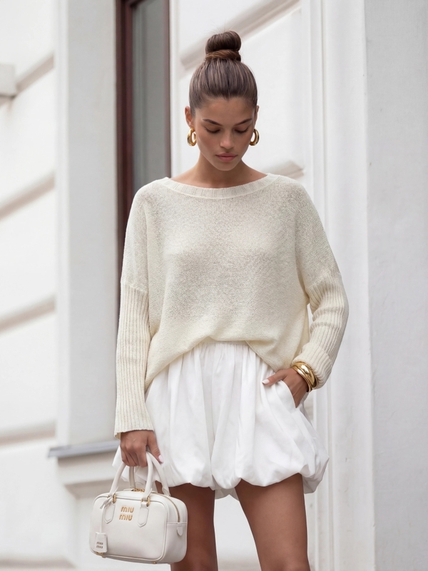 Efektowny, oversize’owy sweter Mavelin w ponadczasowym kolorze świetnie sprawdzi się w zarówno codziennych, jak i eleganckich stylizacjach. Szeroki dekolt i luźny krój równoważą ściągacze na rękawach. Made in Poland. Producent Cocomore. Prezentacja produktu wykorzystuje wizualizacje AI.