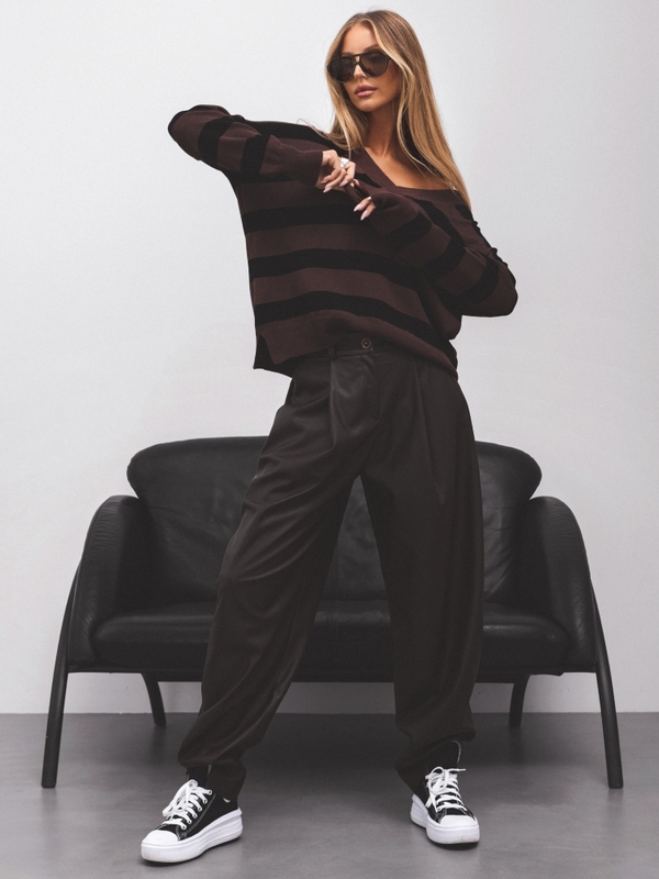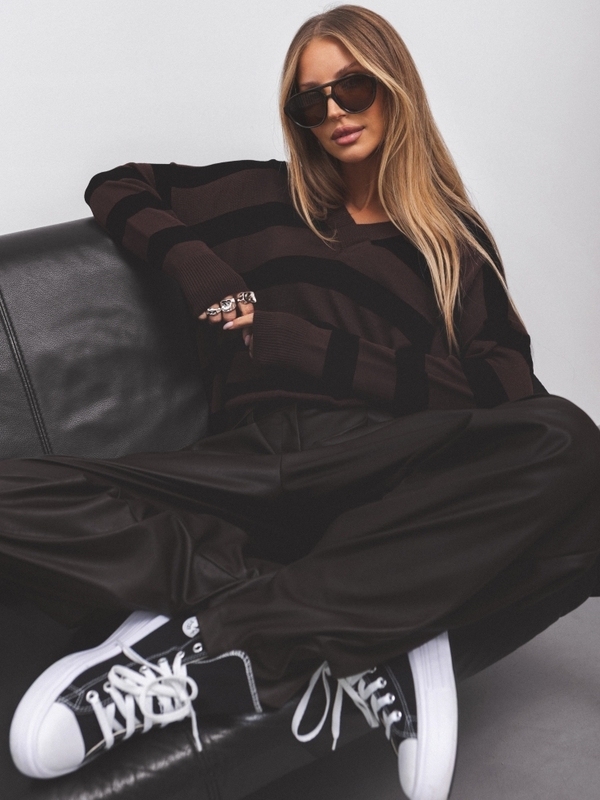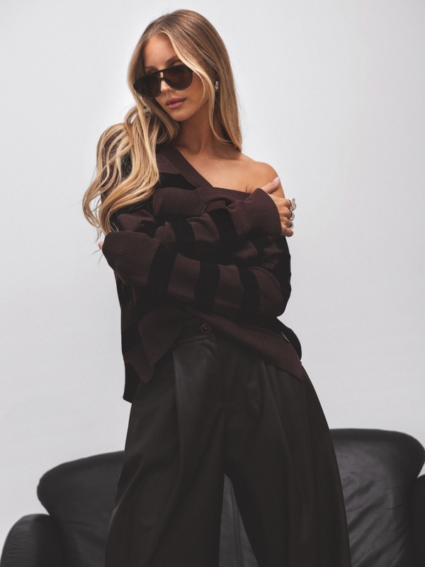 Ponadczasowy, pasiasty sweter Nessa to ciekawa alternatywa dla klasycznej bluzki. Wykonany z wysokiej jakości przędzy. Szyku dodaje kobiecy V-dekolt. Dodatkowym atutem jest ozdobna blaszka z logo producenta i delikatne ściągacze na wykończeniach. Made in Poland.