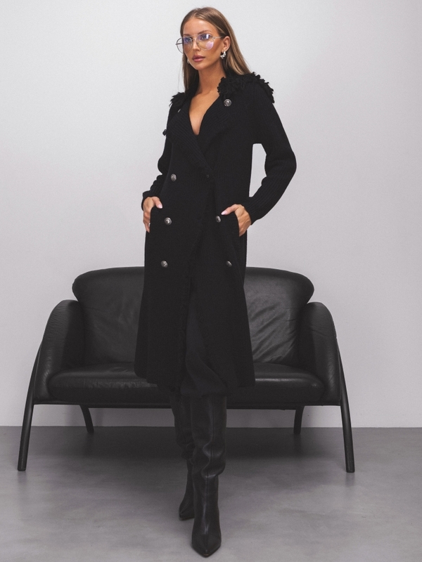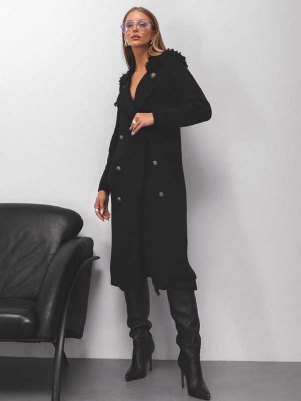 Fantastyczny kardigan Rome to model, który z powodzeniem zastąpi płaszcz w cieplejsze dni. Zapinany na dwurzędowe, kontrastujące guziki. Po bokach znajdują się praktyczne kieszenie. Całość wieńczy szeroki kołnierz, opadający na ramiona, wykończony frędzlami. Polski producent Cocomore.