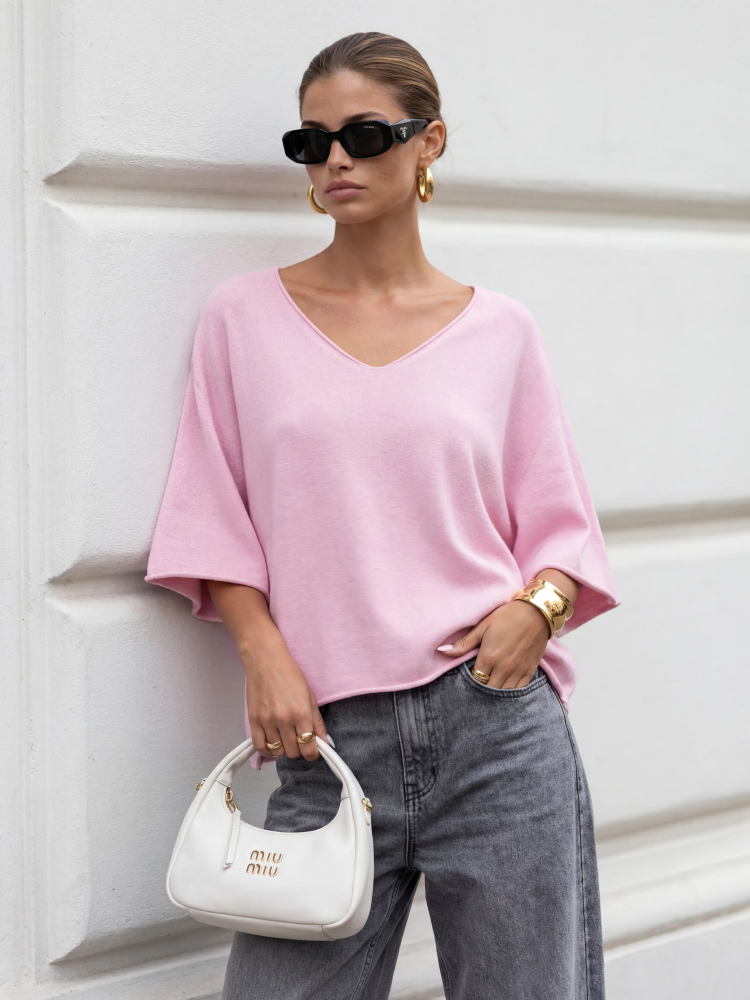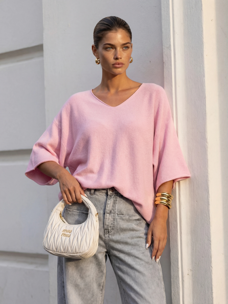Wyjątkowy, luźny sweterek Sanos, wykonany z wysokiej jakości przędzy. Charakteru dodaje kobiecy V-dekolt. Znakomicie spradzi się jako alternatywa dla bluzki. Polski producent Cocomore. Prezentacja produktu wykorzystuje wizualizacje AI.