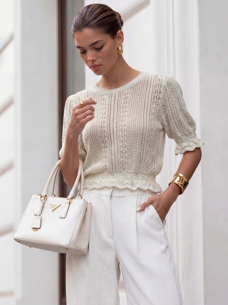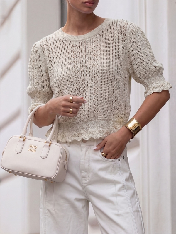 Przepiękny sweterek Silas wykonany z wysokiej jakości przędzy w wyjątkowe, ażurowe wzory. Szyku dodają bufiaste rękawy oraz ściągacze na wykończeniach. Uniwersalna, niebanalna opcja do wielu stylizacji. Made in Poland. Producent Cocomore. Prezentacja produktu wykorzystuje wizualizacje AI.