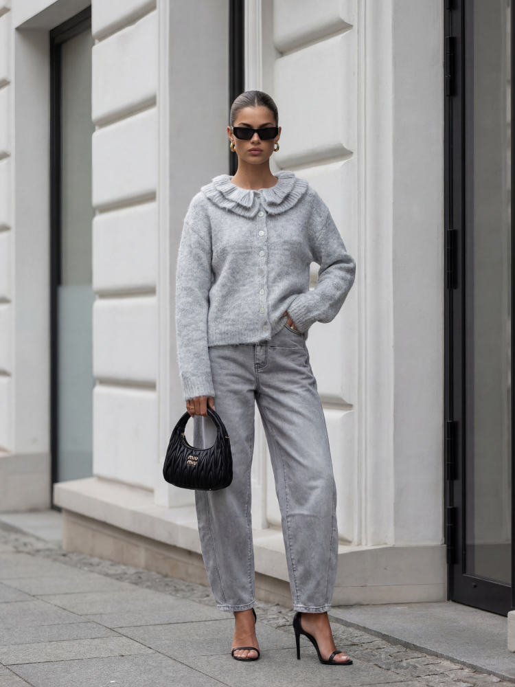 Sweter Virgil to krótki kardigan zapinany na guziki, dzięki czemu tworzy masę opcji do wystylizowania. Wykończenia zdobią subtelne ściągacze. Jego głównym akcentem jest ozdobny kołnierzyk, który nadaje mu niepowtarzalnego uroku. Produkt z importu.  Prezentacja produktu wykorzystuje wizualizacje AI.