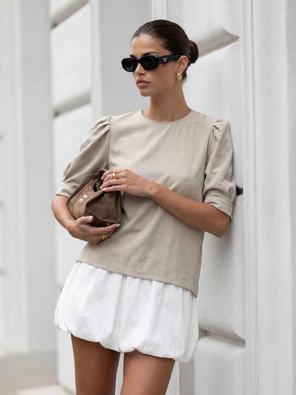 Bluzka Beatrice to model o subtelnie rozszerzanym kroju. Bufiaste rękawy dodają jej niesamowitego szyku i elegancji. Z tyłu znajduje się rozcięcie zapinane na guzik. Uniwersalny fason, który z powodzeniem uzupełni każdą stylizację. Polski producent Cocomore. Prezentacja produktu wykorzystuje wizualizacje AI.