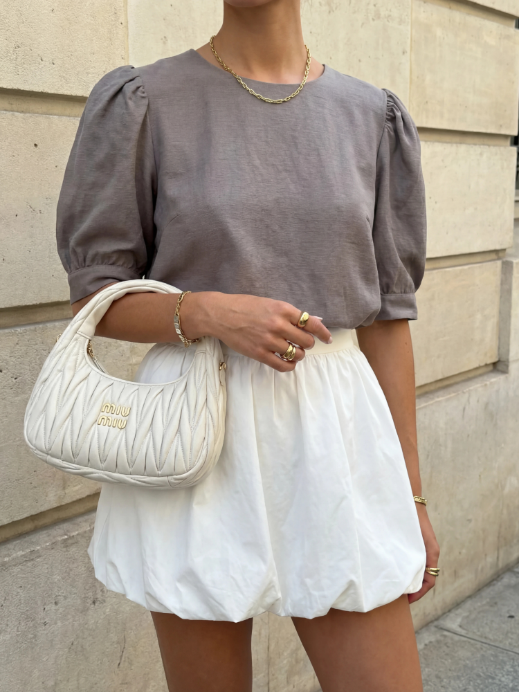 Bluzka Beatrice to model o subtelnie rozszerzanym kroju. Bufiaste rękawy dodają jej niesamowitego szyku i elegancji. Z tyłu znajduje się rozcięcie zapinane na guzik. Uniwersalny fason, który z powodzeniem uzupełni każdą stylizację. Polski producent Cocomore. Prezentacja produktu wykorzystuje wizualizacje AI.