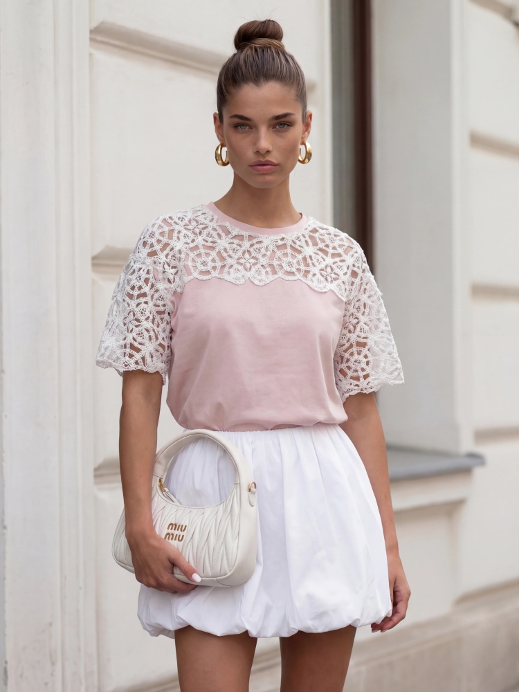 Bluzka Clementine to wyjątkowy model o rozszerzanym kroju, który zapewni swobodę noszenia. Niepowtarzalnego uroku dodaje jej koronkowa, półprzezroczysta wstawka, która uwydatni ramiona. Całość wieńczą bufiaste rękawy zakończone ściągaczami. Polski producent Cocomore. Prezentacja produktu wykorzystuje wizualizacje AI.