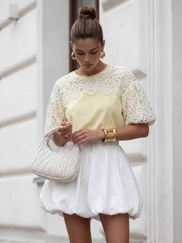 Bluzka Clementine to wyjątkowy model o rozszerzanym kroju, który zapewni swobodę noszenia. Niepowtarzalnego uroku dodaje jej koronkowa, półprzezroczysta wstawka, która uwydatni ramiona. Całość wieńczą bufiaste rękawy zakończone ściągaczami. Polski producent Cocomore. Prezentacja produktu wykorzystuje wizualizacje AI.
