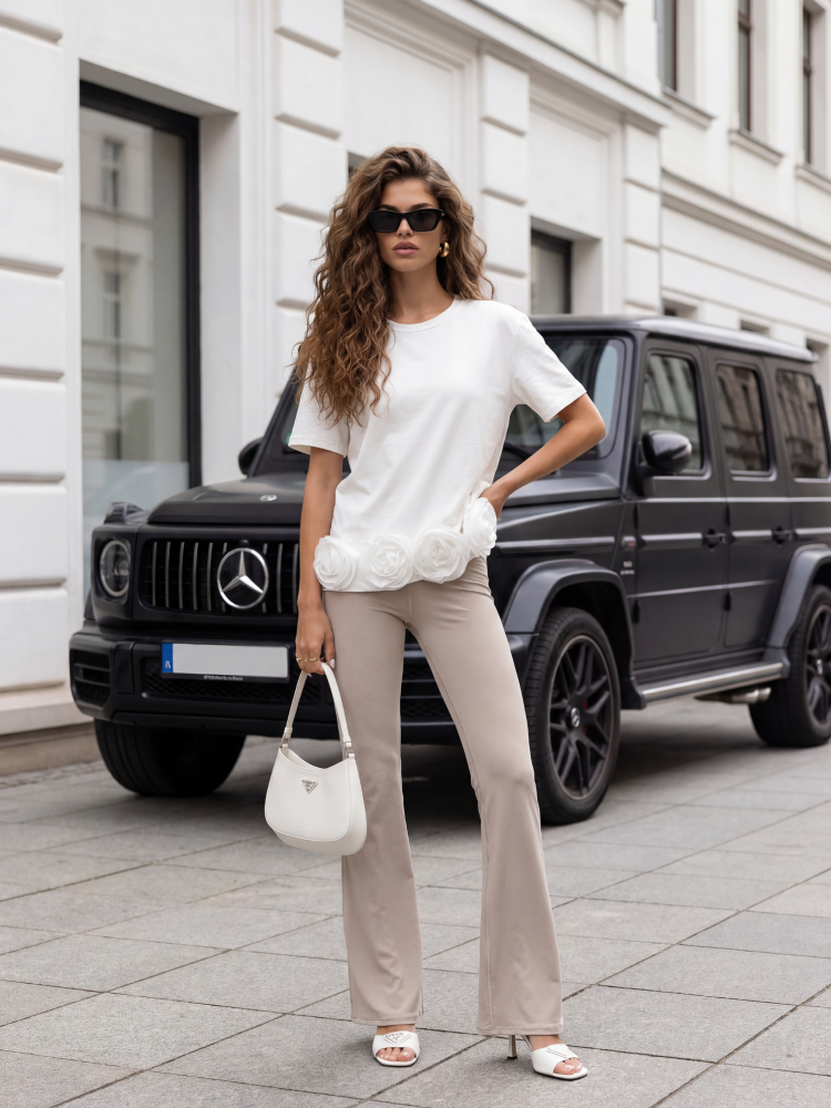 Bluzka Georgiana to niezwykle elegancka propyzja, która znakomicie sprawdzi się jako baza do wielu stylizacji. Wykonana z wysokiej jakości, bawełnianego materiału. Jej prosty krój przełamują naszyte kwiaty na dole. Prezentacja produktu wykorzystuje wizualizacje AI.