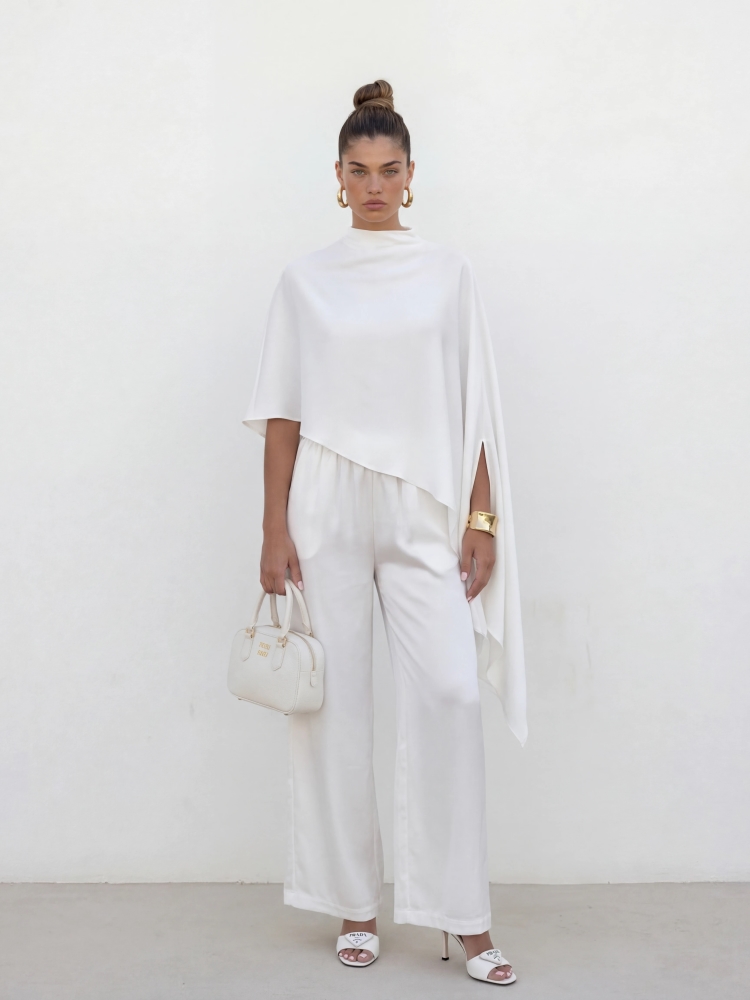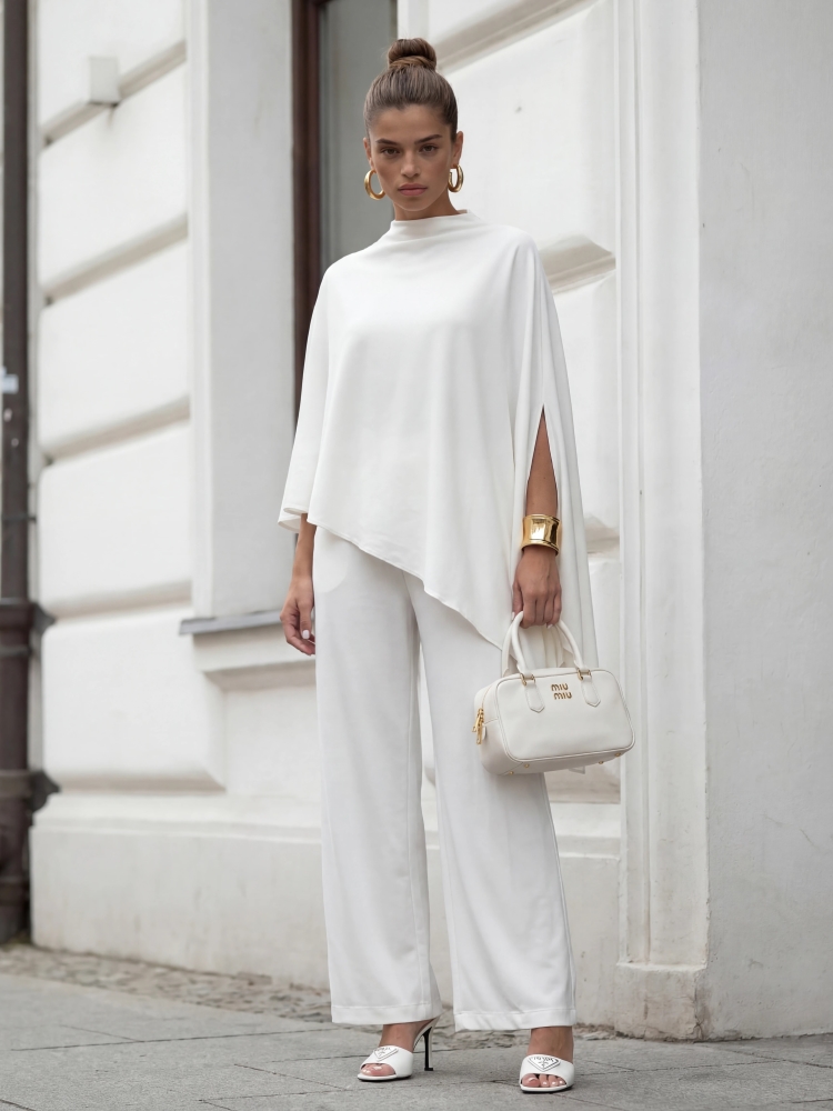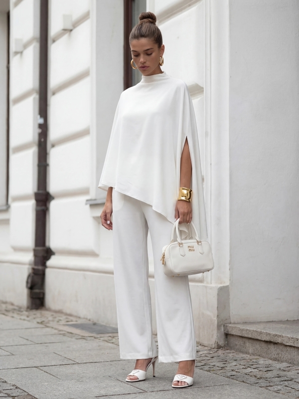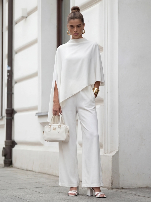 Bluzka Kamalia to niestandardowy model o kroju palto. Oversize'owy krój zapewni komfort i swobodę noszenia. Dodatkowo, asymetryczna długość optycznie wydłuży sylwetkę. Znakomicie sprawdzi się w duecie ze spodniami widocznymi na zdjęciu. Polski producent Cocomore. Prezentacja produktu wykorzystuje wizualizacje AI.