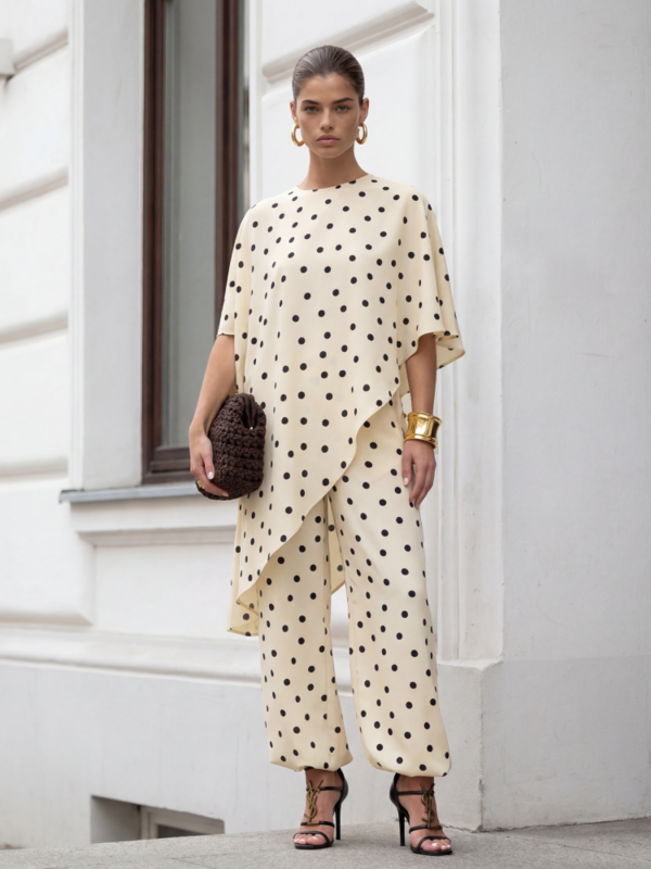 Bluzka Kamalia to niestandardowy model o kroju palto. Oversize'owy krój zapewni komfort i swobodę noszenia. Dodatkowo, asymetryczna długość optycznie wydłuży sylwetkę. Znakomicie sprawdzi się w duecie ze spodniami widocznymi na zdjęciu. Polski producent Cocomore. Prezentacja produktu wykorzystuje wizualizacje AI.