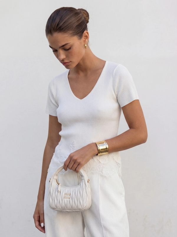 Bluzka Leia to model wykonany z prążkowanego, elastycznego materiału, dzięki czemu idealnie dopasuje się do sylwetki. Jej klasyczny krój został przełamany półprzezroczystymi, koronkowymi wstawkami na dole. Całość dopełnia kobiecy V-dekolt. Znakomicie sprawdzi się jako baza do wielu stylizacji. Prezentacja produktu wykorzystuje wizualizacje AI.
