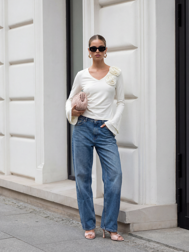 Bluzka Maudina to bawełniany model z domieszką elastanu, który zapewni idealne dopasowanie do sylwetki. Kobiecy V-dekolt podkreślają naszyte przy ramieniu kwiaty. Poduszki na ramionach oraz subtelne marszczenie z boku to jej kolejne atuty. Dodatkowo, rękawy zakończone rozszerzanymi, dwurzędowymi falbanami zostały uzupełnione rozcięciem. Polski producent Cocomore.