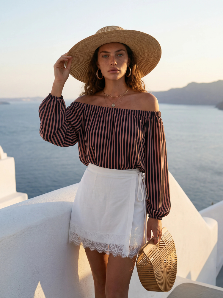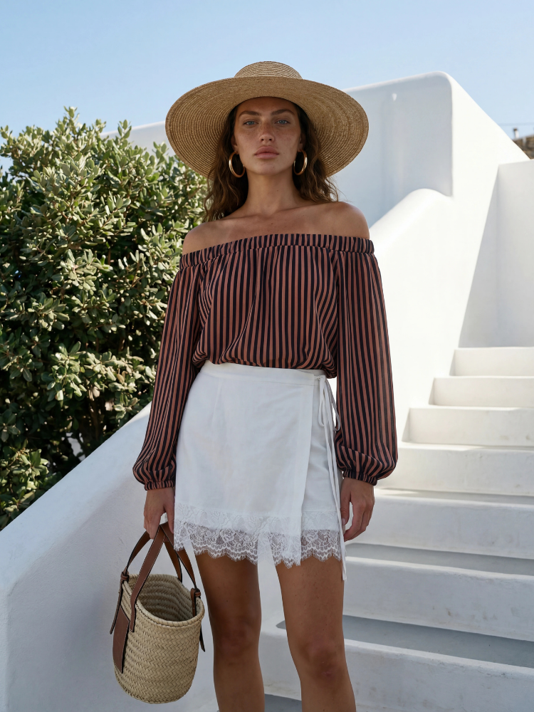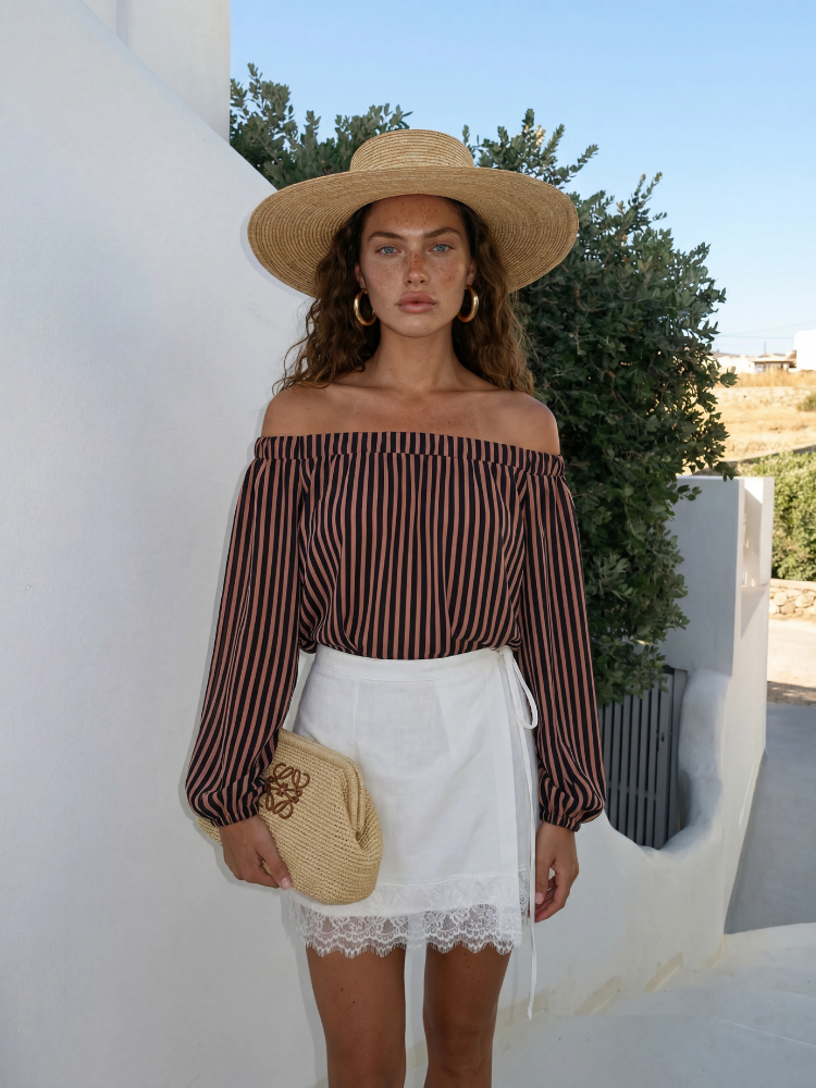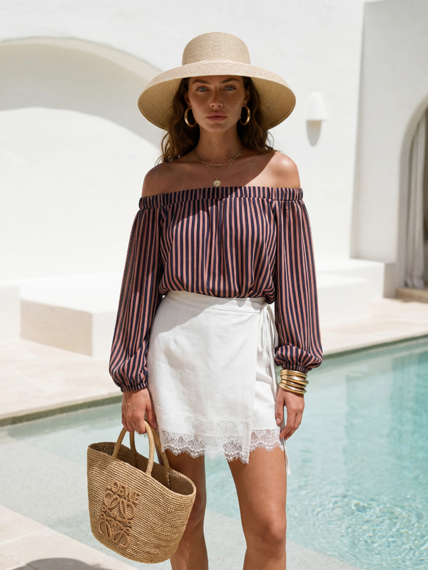 Wyjątkowa, pasiasta bluzka hiszpanka Maya, wykonana z materiału wysokiej jakości. Świetnie sprawdzi się zarówno do pracy, jak i na wieczór. Na rękawach i dekolcie znajdują się praktyczne ściągacze, dzięki którym można dowolnie regulować długość. Made in Poland. Prezentacja produktu wykorzystuje wizualizacje AI.