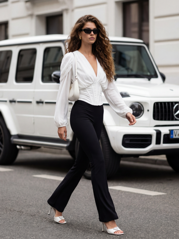 Bluzka Sudie wykonana z wysokiej jakości, półprzezroczystego materiału. Kobiecy V-dekolt równoważy gorsetowy dół, który dopełniony został z tyłu szerokim ściągaczem. Całość wieńczą bufiaste rękawy zakończone ściągaczami oraz marszczenia na ramionach. Prezentacja produktu wykorzystuje wizualizacje AI.