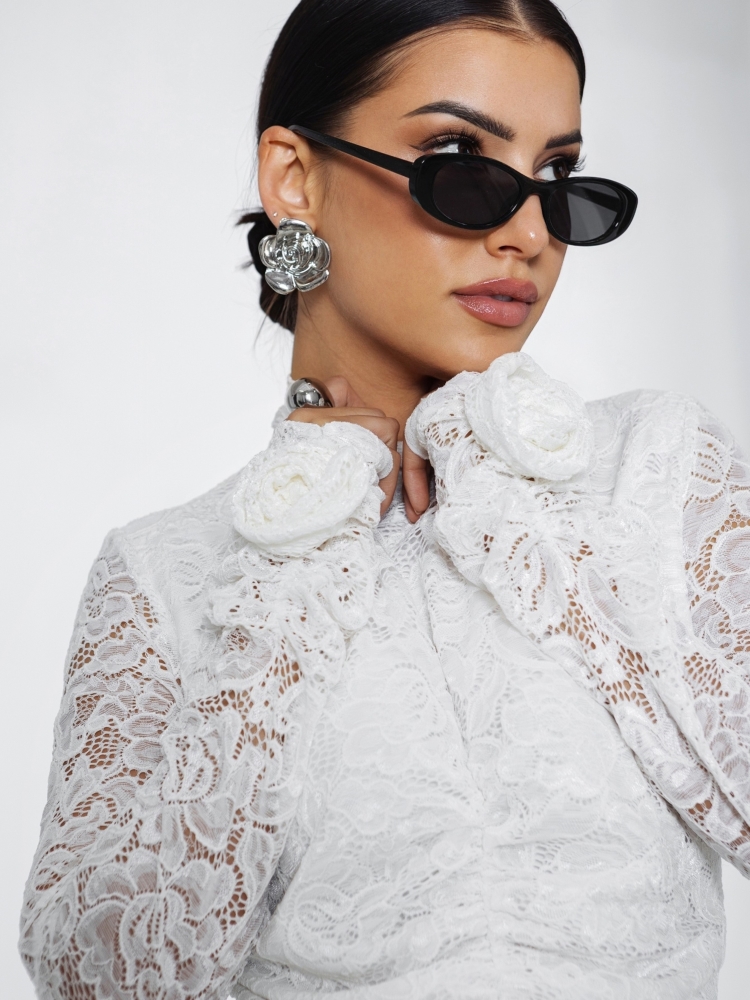 Niezwykle kobieca bluzka Wisteria, wykonana z półprzezroczystego, koronkowego materiału. Całość dopełnia marszczenie z przodu oraz rękawy wykończone przyszytymi kwiatami. Z tyłu znajduje się subtelne rozcięcie zapinane na guziki. Znakomicie sprawdzi się jako baza do wielu stylizacji. Polski producent Cocomore.