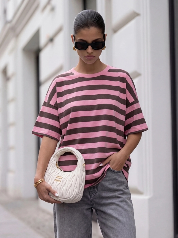 Fantastyczny, overize'owy t-shirt Maxence w uniwersalne, dwukolorowe pasy. Wykonany z wysokiej jakości bawełnianego materiału z domieszką elastanu. Jego atutami jest klasyczny, okrągły kołnierzyk oraz opuszczona linia ramion. Prezentacja produktu wykorzystuje wizualizacje AI.