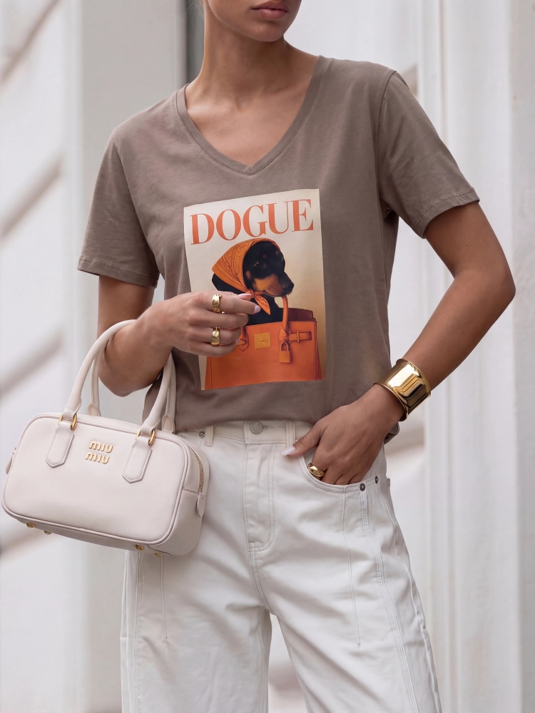 Oversize'owy t-shirt Rosamund, wykonany został z wysokiej jakości elastycznego materiału. Przód zdobi artystyczny nadruk, który przełamuje jego klasyczny akcent. Całość dopełnia kobiecy V-dekolt. Znakomicie sprawdzi się jako uzupełnienie stylizacji. Polski producent Cocomore. Prezentacja produktu wykorzystuje wizualizacje AI.