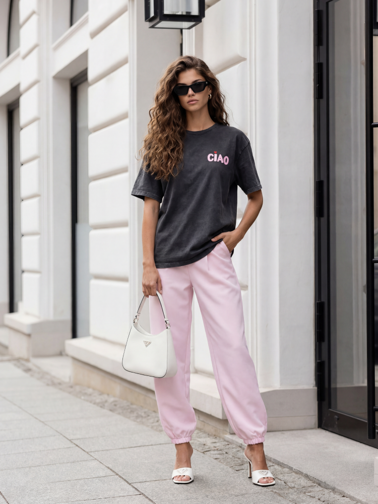Oversize'owy t-shirt Teris, to model wykonany z wysokiej jakości bawełnianego materiału. Wyjątkowego uroku dodają mu kontrastujące nadruki z przodu i z tyłu. Świetnie sprawdzi się jako uzupełnienie stylizacji. Prezentacja produktu wykorzystuje wizualizacje AI.