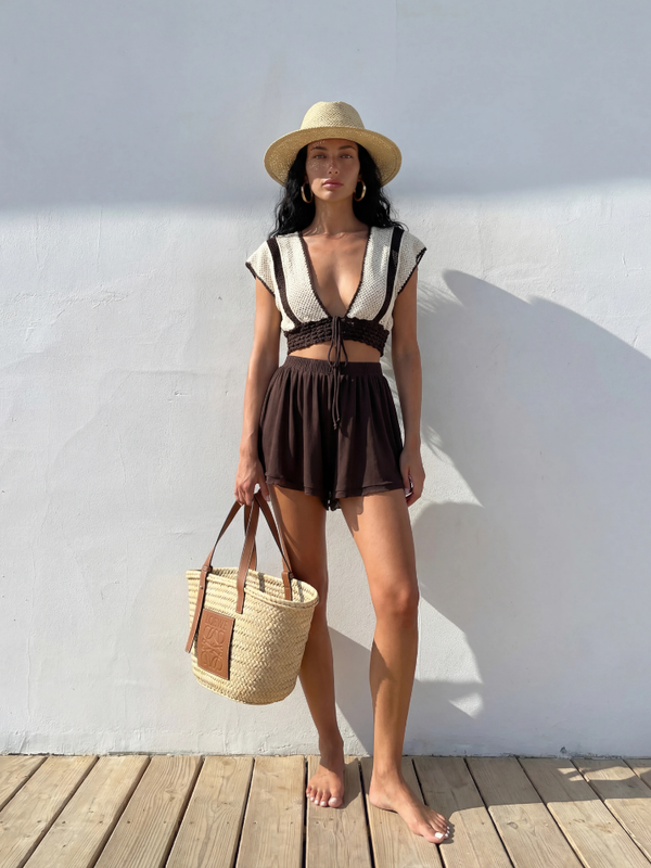Genialny, sweterkowy top Oliviera o ażurowym splocie. Dół został wykończony szerokim ściągaczem z wiązaniem. Z powodzeniem sprawdzi się w upalne dni. Skompletuj ze spódnicą widoczną na zdjęciach. Polski producent Cocomore.